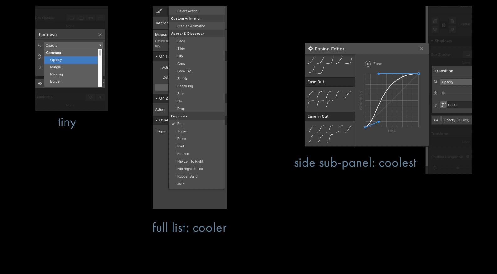 It doesn't have to be a long list like the new IX2 lists of animations presets. It could be a side sub-panel. Only custom easing curves use a side sub-panel in Webflow. That's unfortunate because I think this UI pattern works great and prevent lists to be too vertical.