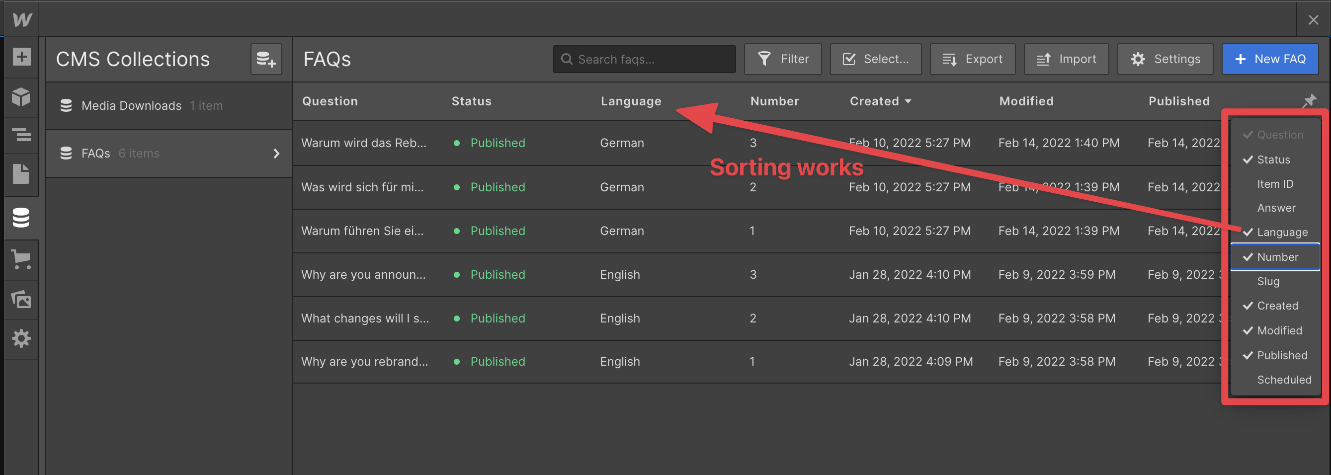 Currently its only possible to sort the CMS items inside a collection in the CMS panel itself. Also there are a few limited filter possibilities. Would be very cool to add custom filters from the CMS collection fields here. See Screenshots.