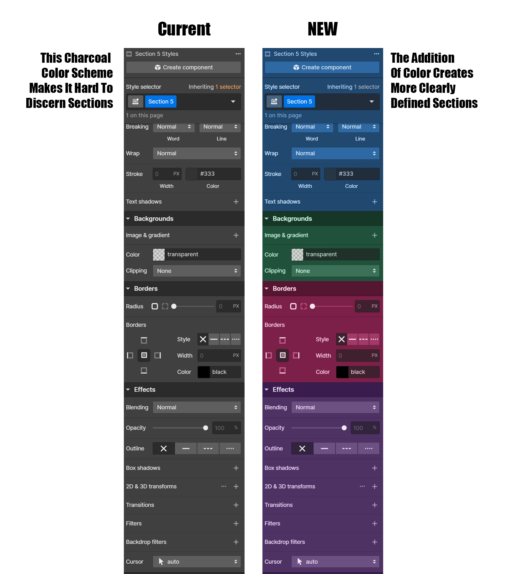 Add color variations to each menu section. Users could choose a color for each section which provides the best contrast or simply has the look they want to work within. It would add a touch of personality to the user's workspace while also giving visually impaired users an option for clearly defining their menu.